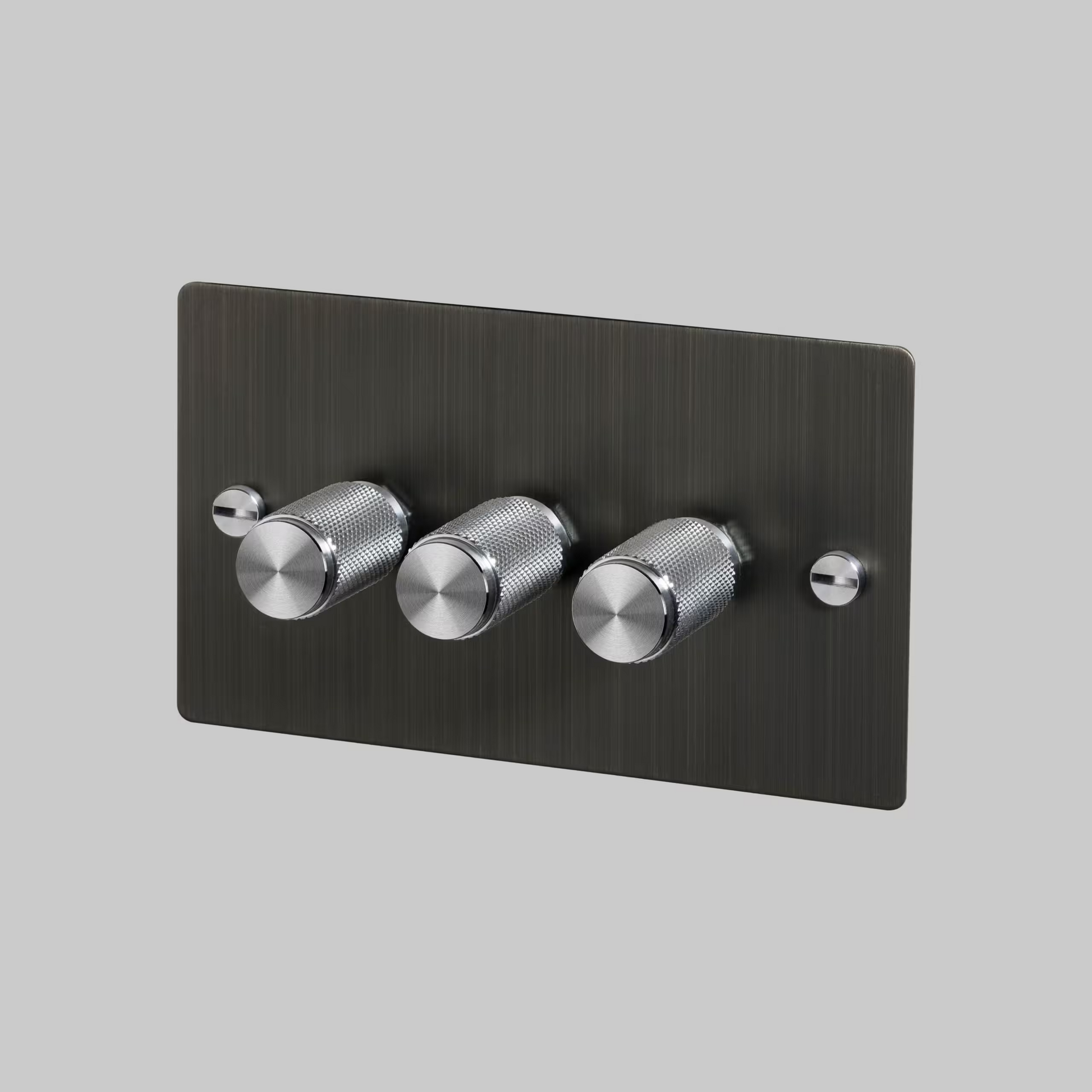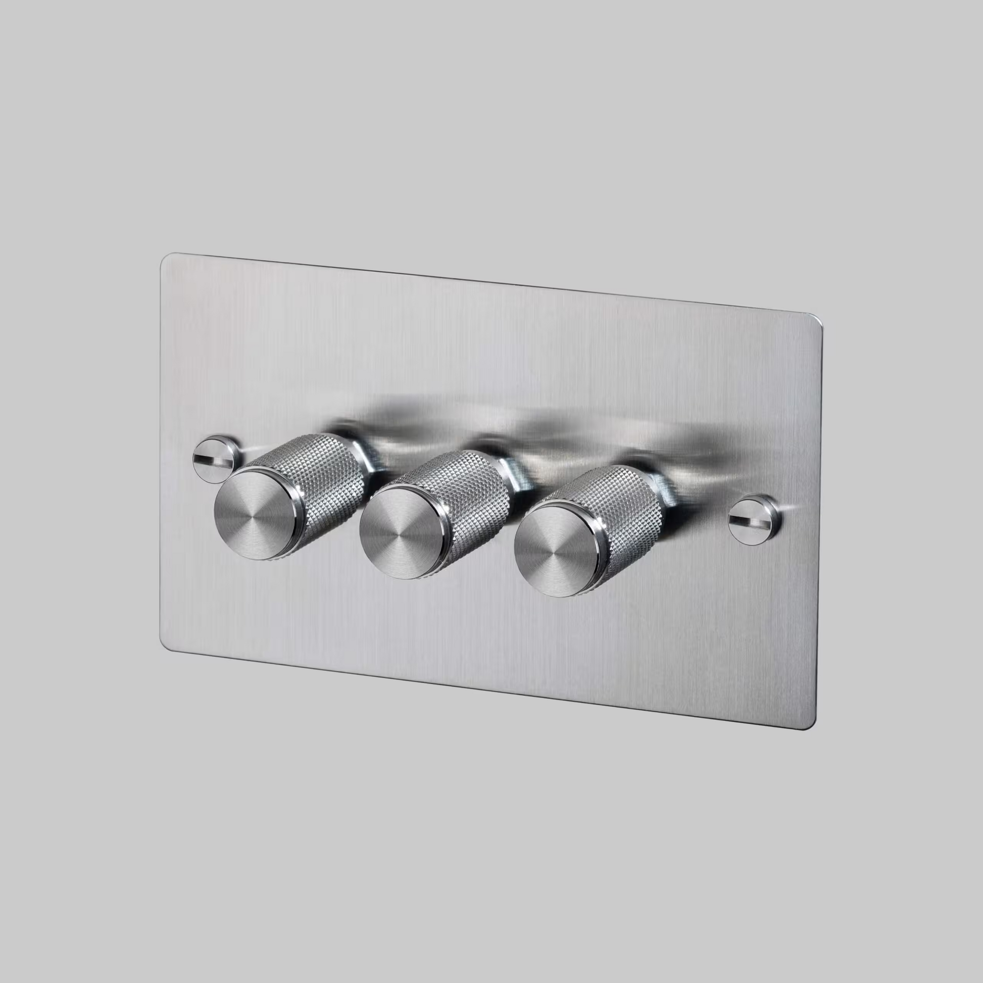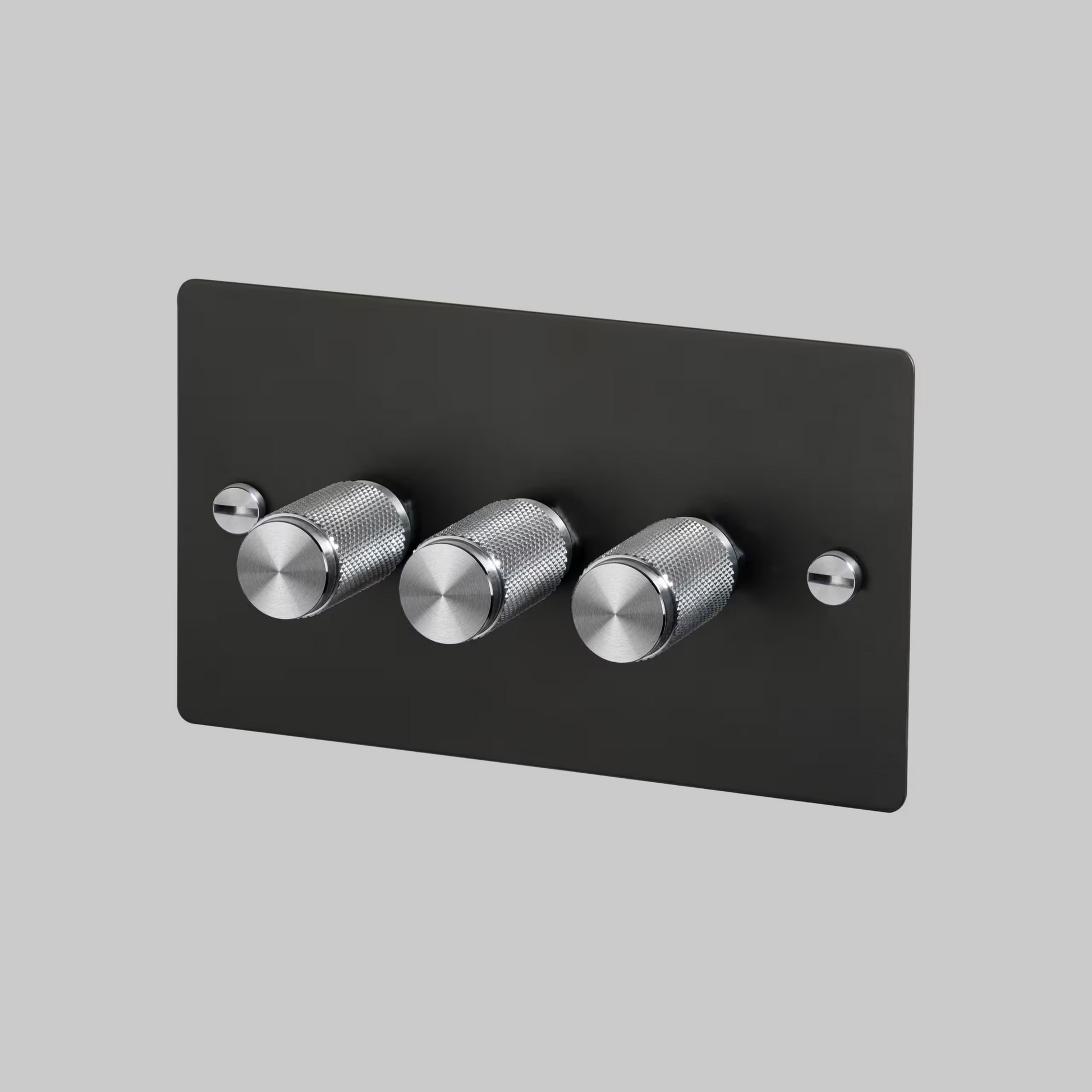 The dimmer knob features our signature, diamond-cut, cross knurl pattern and the flat plate is fixed with our signature, solid metal, coin screws.