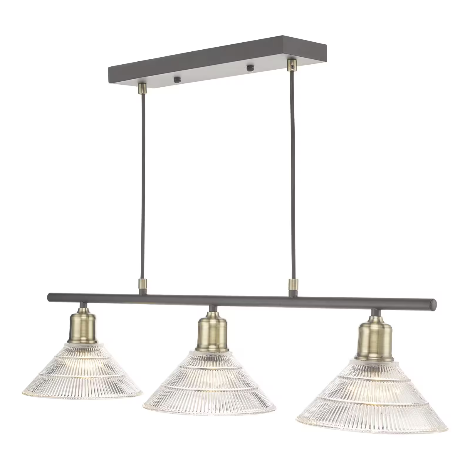 The prismatic shade offers an industrial style reminiscent of old factory lighting. The 3 light bar format lends its self to hanging over a long table or breakfast bar. Featuring 1m of black braided cable that can be shortened on installation. The Boyd 3 light bar pendant is suitable for sloped ceilings.