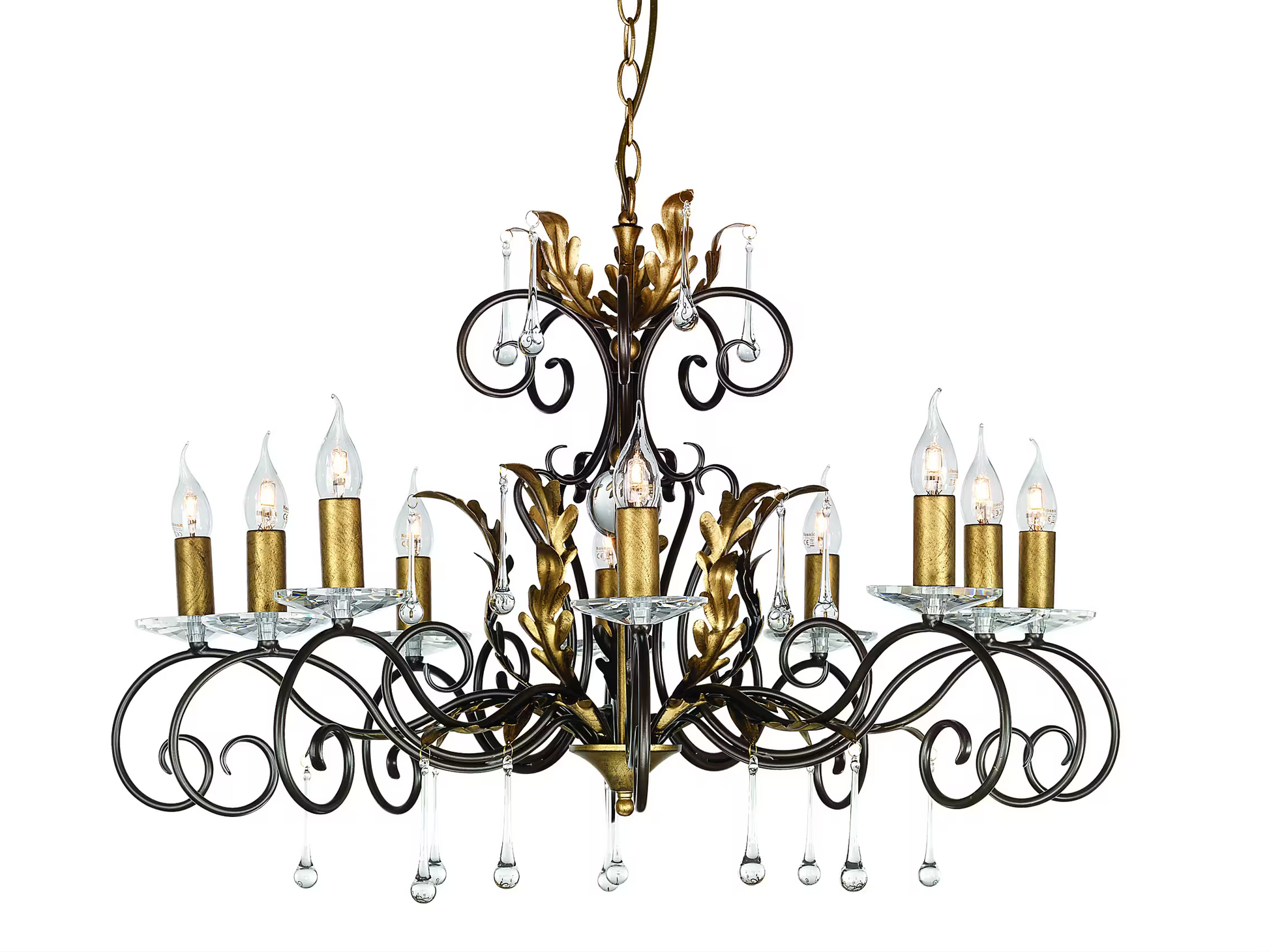 Designed and manufactured exclusively by Elstead, this handmade range features traditionally forged scrolls and antiqued oak leaves. Fittings are dressed in clear glass drops and cut glass sconces.