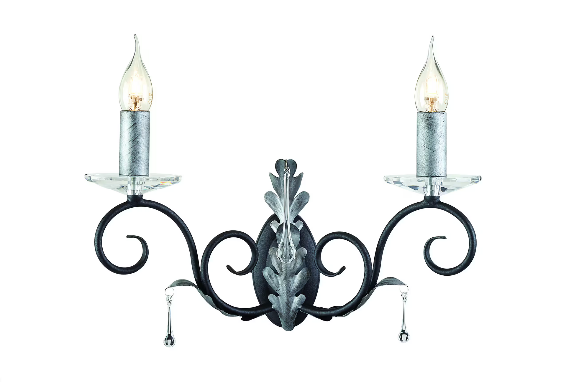 Designed and manufactured exclusively by Elstead, this handmade range features traditionally forged scrolls and antiqued oak leaves. Fittings are dressed in clear glass drops and cut glass sconces.