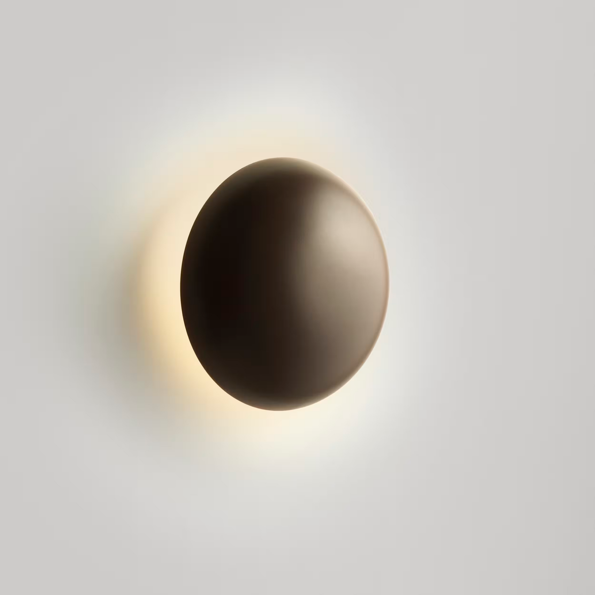Babila comes in two sizes, 18 and 28 cm in diameter, and is also available in white or brown varnished aluminium, more discreet versions than the chrome one. In all of them an aura of blurred light is generated, a detail that contrasts with its material. Its lighting is indirect, soft on the wall, and well integrated into outside spaces.