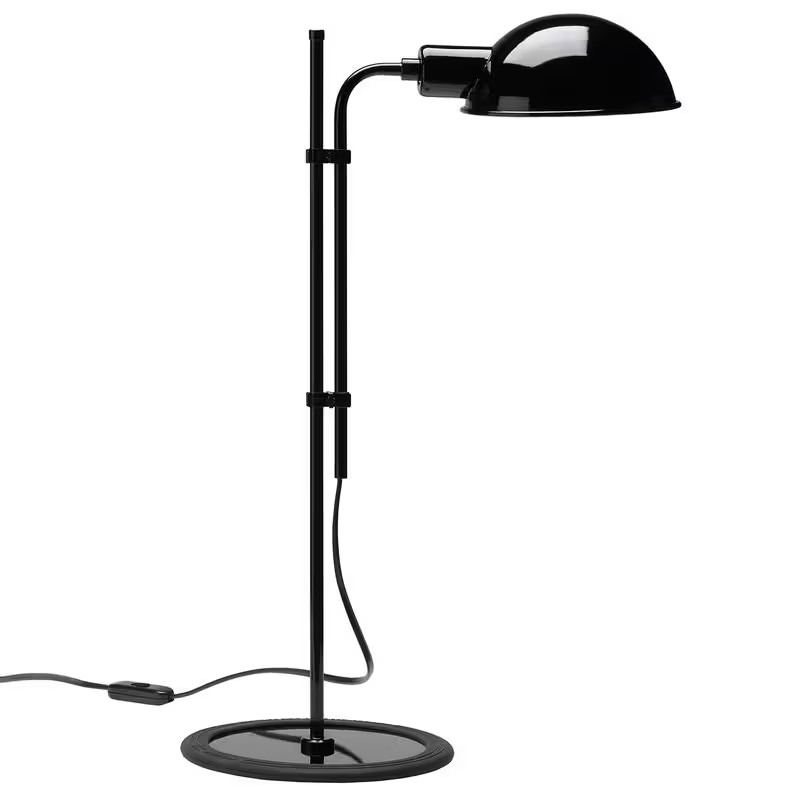 Base and stem in lacquered iron. Shade made of lacquered aluminium. Base wrapped with black rubber.