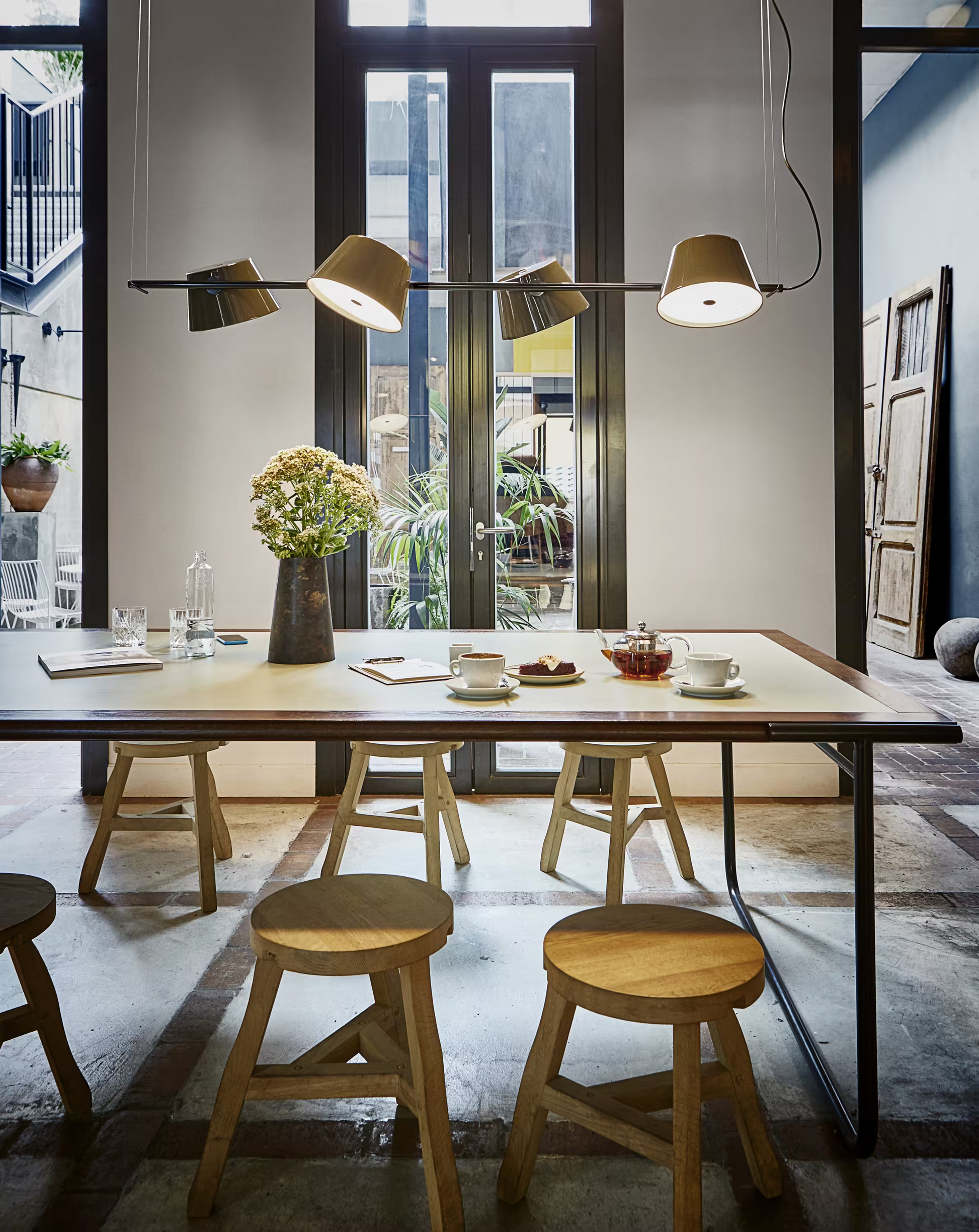 Metal structure lacquered in black. Lacquered aluminum lampshades adjustable 360º in any direction. On the lower part, an opal methacrylate diffuser softens the light.