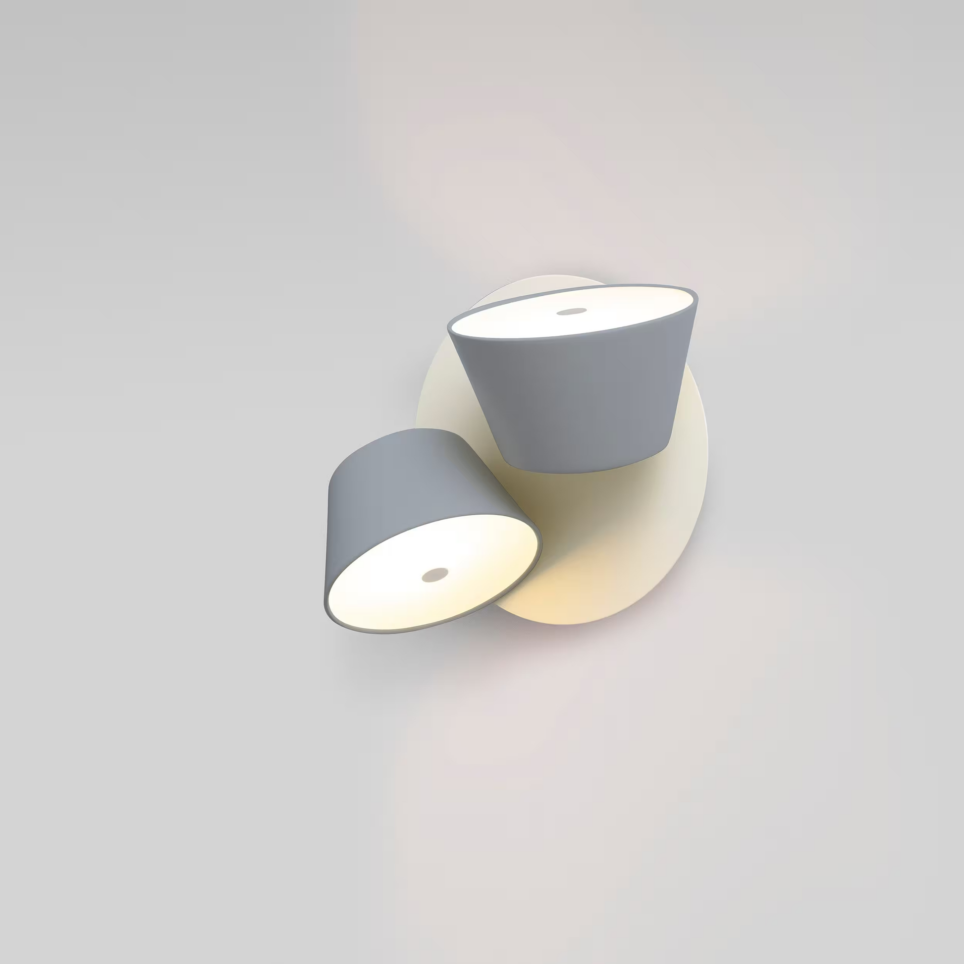 White lacquered metal plate. Shades made of lacquered aluminium with an opalescent methacrylate diffuser over the open end.